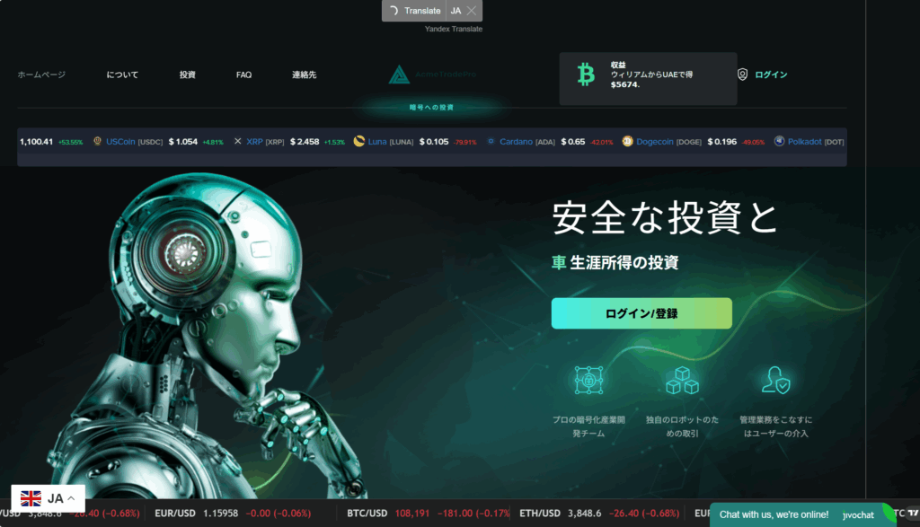 「AcmeTradePro」とは、主に仮想通貨の取引を行うプラットフォームを提供していると主張するウェブサイトです。公式サイトでは、さまざまな仮想通貨に関する情報を提供し、利用者に向けて簡単に取引ができる環境を整えていると説明されています。投資家を魅了するため、特に「高収益」「即時の利益獲得」を強調し、見込み客に多額の投資を促していることが特徴です。