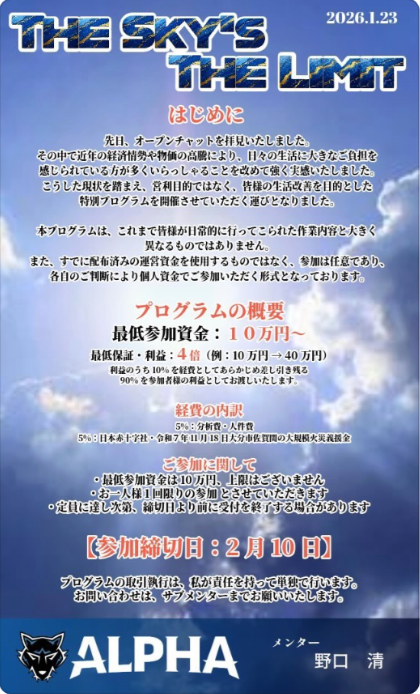 こうした詐欺の中でも、最近注目を集めているのが「ALPHA「THE SKY’S THE LIMIT」」と呼ばれる業者です。公式サイトでは「高利益を保証する投資プラットフォーム」として魅力的な内容を謳っていますが、その実態には多くの疑問が寄せられています。