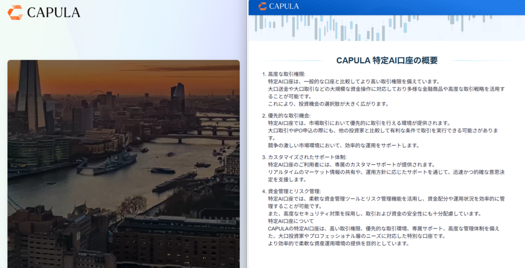 CAPULA 特定AI口座の概要高度な取引権限:特定AI口座は、一般的な口座と比較してより高い取引権限を備えています。大口送金や大口取引などの大規模な資金操作に対応しており多様な金融商品や高度な取引戦略を活用することが可能です。これにより、投資機会の選択肢が大きく広がります。優先的な取引機会:特定AI口座では、市場取引において優先的に取引を行える環境が提供されます。大口取引やIPO申込の際にも、他の投資家と比較して有利な条件で取引を実行できる可能さがあります。競争の激しい市場環境において、効率的な運用をサポートします。カスタマイズされたサポート体制:特定AI口座のご利用者には、専属のカスタマーサポートが提供されます。リアルタイムのマーケット情報の共有や、運用方針に応じたサポートを通じて、迅速かつ的確な意思決定を支援します。資金管理とリスク管理:特定AI口座では、柔軟な資金管理ツールとリスク管理機能を活用し、資金配分や運用状況を効率的に管理することが可能です。また、高度なセキュリティ対策を採用し、取引および資金の安全性にも十分配慮しています。特定AI口座についてCAPULAの特定AI口座は、高い取引権限、優先的な取引環境、専属サポート、高度な管理体制を備えた、大口投資家やプロフェッショナル層のニーズに対応した特別な口座です。より効率的で柔軟な資産運用環境の提供を目的としています。