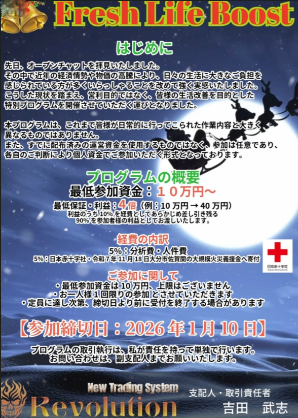 Fresh Life Boost【Revolution】はまた、利用者に対して「わずかな投資で巨額の利益を得られる」といった宣伝文句を掲げ、トレードや投資を誘導します。たとえば、高収益を実現するための投資プランや、他の投資家と競り合うようなエンターテイメント性を持った取引イベントを開催することで、さらに利用者を引き込む手法が取られています。しかし、このようなプランやイベントの詳細は不明瞭であり、実際には投資家に対して利益を還元することなく、資金を巻き上げることが目的である場合が多いのです。